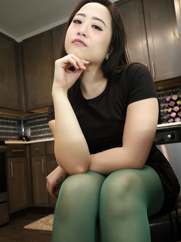 You stop by my place to share a glass or two, and I noticed you couldn't stop staring at my legs in these green tights. I don't mind teasing you a bit in my short little dress to the point where I see your cock growing for me. Do you want to rip a hole in these sheer stockings and get easy access to my juicy pussy? Sip up my creaminess and enjoy these beautiful thighs and feet wrapped around you.